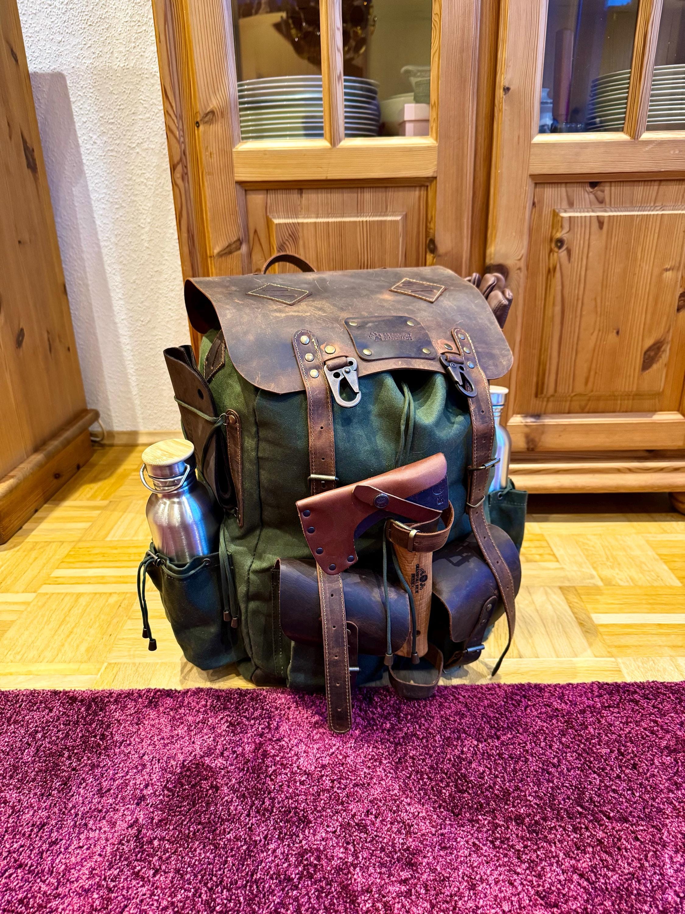Tips: 200 USD Discount | Bushcraft Design Finalist| Handmade Leather and Waxed Backpack for Travel, Camping,Military | 45 Liter | Personalization